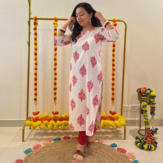 Saadgi Handblock Printed Kurta_Red & White