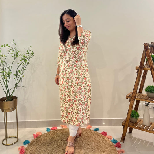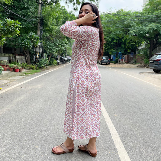 Rozana Everyday Handblock Printed Kurta_Pink & White