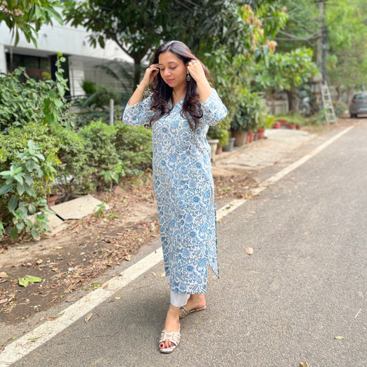 Rozana Everyday Handblock Printed Kurta_Blue & White