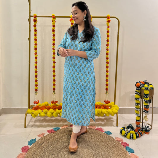 Saadgi Handblock Printed Kurta_Firozi Blue