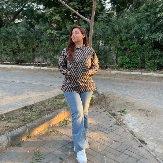 Hand Block Printed Hoodie - Blooming Black