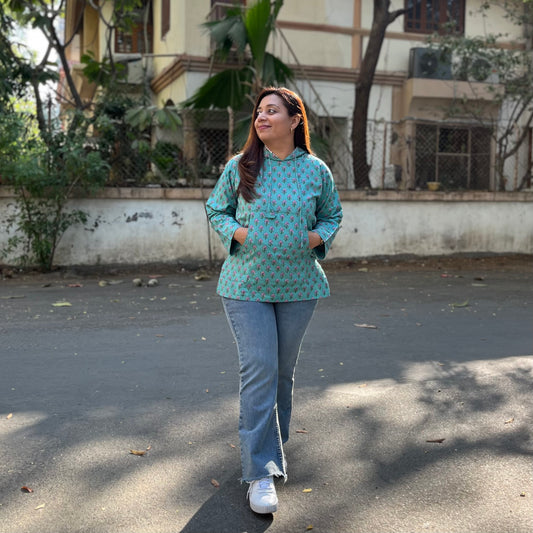 Hand Block Printed Hoodie - Turquoise
