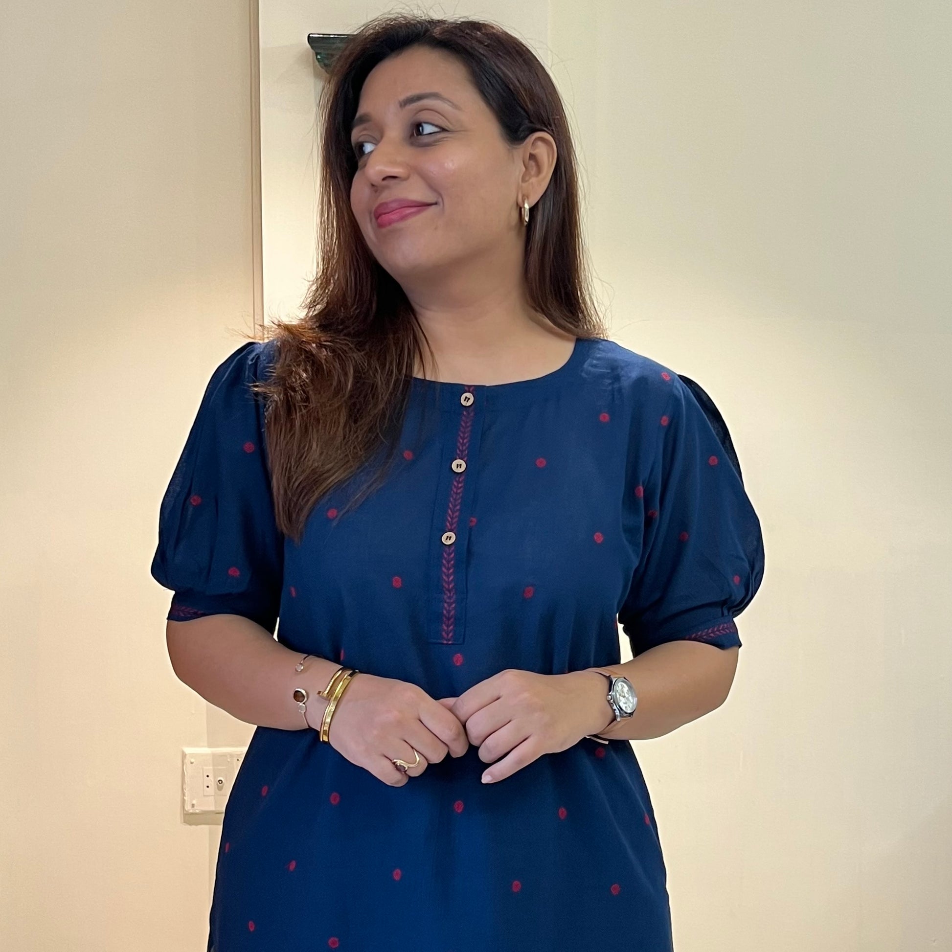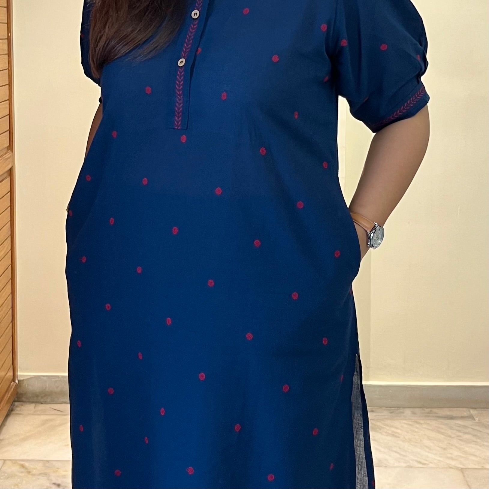 Introducing Kapaas, our first handloom edit. Crafted in soft handloom cotton, this kurta set (KURTA + PANT) balances craftsmanship with contemporary design. It is specially tailored in a relaxed fit to flatter every body type. The rounded hemline and openable wooden buttons lend a refined character, while the statement sleeves make it distinct yet timeless. The pants are elasticated to maximise comfort. The best part you can even use the kurta & pants as spearates and pair them with others from your wardrobe, making a super versatile set. From workwear to after- hours - Kapaas redefined easy sophistication in its purest form.